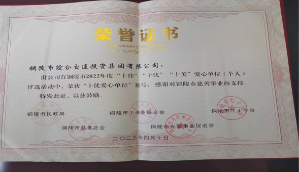 近日,2022年度市“十佳”“十優”“十美”愛心單位評選出爐,集團公司被授予“十優愛心單位”榮譽稱號。