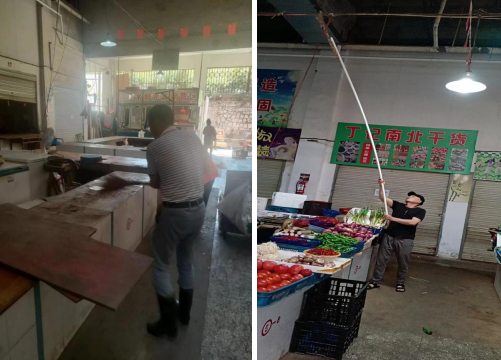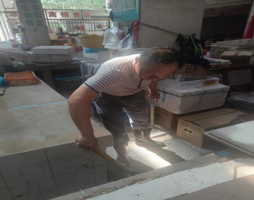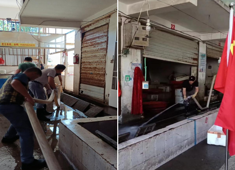 7月8日下午2點,物管公司黨支部書記、經理王春帶領黨員職工和部分群眾對世界花園農貿市場攤位衛生死角和水產、光禽區進行了針對性的集中清理。清理過程中,市場內沉積物散發出難聞的氣味,但參加勞動的工作人員不怕臟、不怕累,頂著高溫酷暑,個個大汗淋漓,大家手拿掃帚、水槍對市場地面、攤位臺面、水產區和光禽區的內部地面和排水溝進行了全方位、無死角的清掃沖洗,整個勞動場面井然有序、熱火朝天。下午5點,經過近三個小時的清理,農貿市場煥然一新,攤位和水產、光禽區等變得光潔如新,物品擺放整齊有序,環境衛生狀況得到了明顯改善,市場面貌有了進步提升。