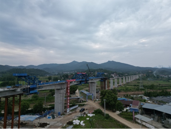 橫埠特大橋連續(xù)梁全長137.2米,一聯(lián)三孔(40+56+40)米,采用懸臂澆筑法施工。橫埠特大橋連續(xù)梁的順利合龍,是繼仙人山隧道、黑山隧道、七家山隧道貫通、首座站房封頂、首榀T梁成功澆筑后,又一重大關(guān)鍵性節(jié)點。