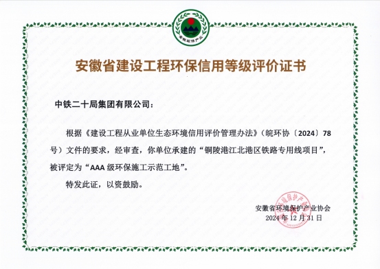 近日,安徽省環(huán)境保護(hù)產(chǎn)業(yè)協(xié)會公布2024年第5批建設(shè)工程從業(yè)單位生態(tài)環(huán)境信用評價結(jié)果,銅陵江北港鐵路專用線項目榮獲安徽省“AAA級環(huán)保施工示范工地”榮譽稱號。