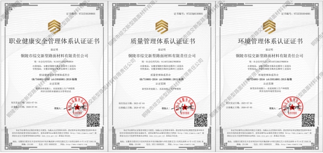 近日,綜交新型路面材料公司順利取得ISO“三體系”(ISO9001質量管理體系、ISO14001環境管理體系、ISO45001職業健康安全管理體系)認證證書,這是我司在提升企業綜合實力過程中取得的新進展,標志著我司在精細化、制度化、規范化管理方面邁上了新臺階。