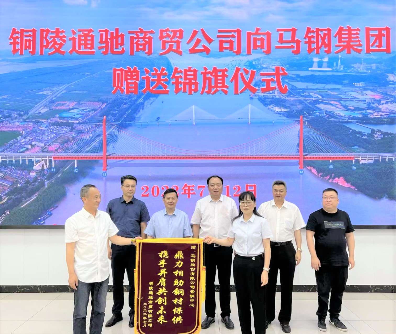 會談期間,通馳商貿向馬鋼集團贈送一面抒有“鼎力相助鋼材保供 攜手并肩共創未來”的錦旗,感謝馬鋼集團在疫情期間對G3公鐵橋材料保供工作做出的突出貢獻。