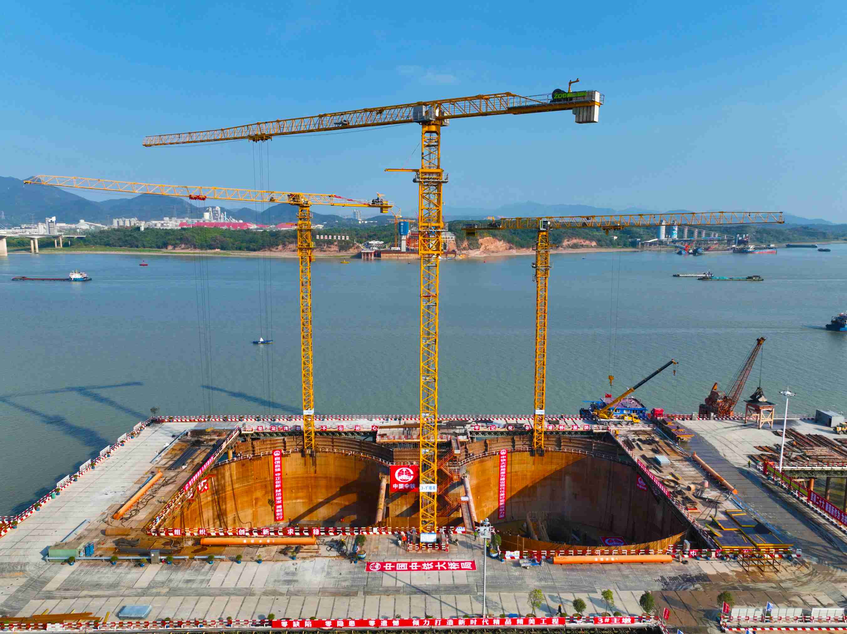 3號墩是G3大橋主塔墩,建成后高253.5米,相當于85層樓高。3號墩承臺面積比11個標準籃球場還大。承臺高7米,混凝土總量26292立方米。該承臺規模巨大、構造復雜、施工技術難點多、工期控制緊、質量要求高,是G3大橋施工的關鍵控制點之一。
