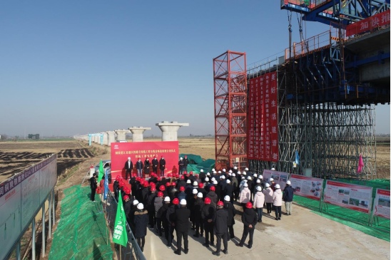 12月15日上午,銅陵港江北港區鐵路專用線工程全線首座連續梁合龍儀式暨施工現場觀摩會在施工現場舉行。集團公司黨委書記、董事長何成龍,黨委副書記、總經理周文勝,黨委委員、副總經理黃勇,中鐵建長江(銅陵)港鐵建設運營有限公司董事長徐重陽,監理、設計等單位負責人及相關人員出席了本次活動。銅陵江北港鐵路專用線公司董事長、總經理張葉來主持合龍儀式,市鐵路辦副主任王濱受邀參加活動并講話。
