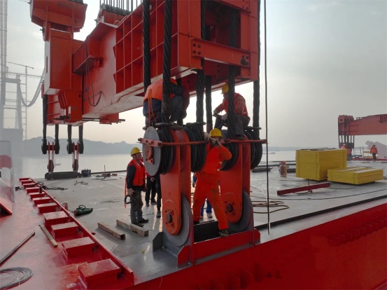 世界首座雙層斜拉-懸索協(xié)作體系大橋,主跨988米。主橋鋼梁采用直桁斷面和三角桁布置形式,分為斜拉區(qū)段、懸吊區(qū)段、斜拉懸吊交叉區(qū)段三部分。鋼梁受力體系不同,剛度差異大,線型控制及合龍難度大。全橋鋼梁共計(jì)6.66萬噸,分為59個(gè)節(jié)段,最大節(jié)段重量約1600噸。此次架設(shè)的鋼梁是邊跨Z0-Z1節(jié)段,長14米,桁寬35米、桁高13.5米,重達(dá)1230噸。