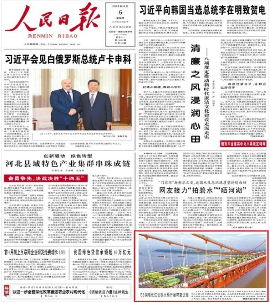人民日?qǐng)?bào)6月5日頭版報(bào)道《G3銅陵長(zhǎng)江公鐵大橋開(kāi)展荷載試驗(yàn)》