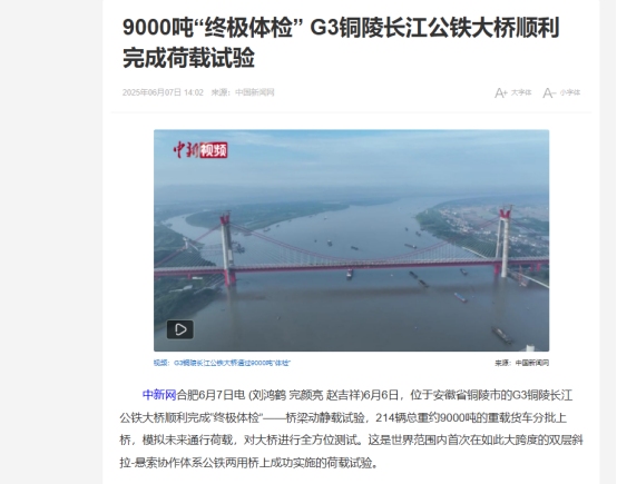中國(guó)新聞網(wǎng)6月7日推出《9000噸“終極體檢” G3銅陵長(zhǎng)江公鐵大橋順利完成荷載試驗(yàn)》