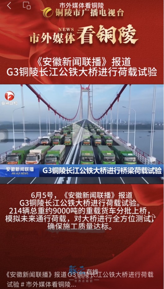 《安徽新聞聯(lián)播》報(bào)道《G3銅陵長(zhǎng)江公鐵大橋進(jìn)行荷載試驗(yàn)》