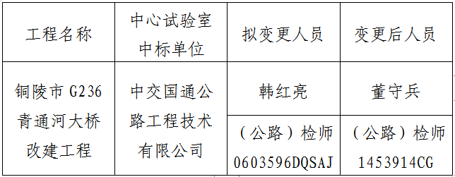 銅陵市G236青通河大橋改建工程中心試驗室,于2019年9月29日開標,中標單位為中交國通公路工程技術有限公司。因原中標項目負責人個人家庭原因,無法到崗履行合同責任與義務,故中交國通公路工程技術有限公司申請中心試驗室項目負責人變更。現將項目負責人變更情況予以公示,如有異議,請于7日內向銅陵市綜合交通投資集團有限公司反映。