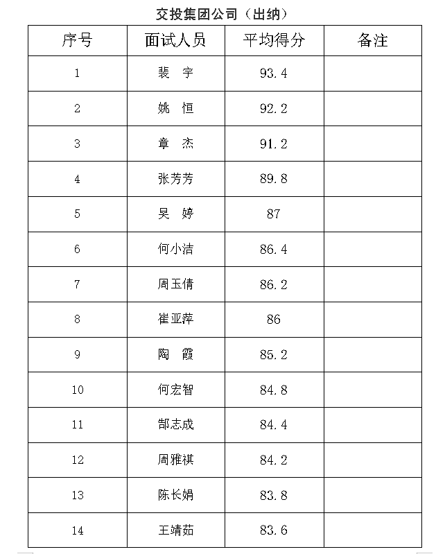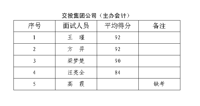 各位考生: 根據《銅陵市綜合交通投資集團有限公司公開招聘人員公告》,我公司已于2021年8月6日開展銅陵市綜合交通投資集團有限公司出納、主辦會計面試工作,現將報名參與人員面試成績公示如下: