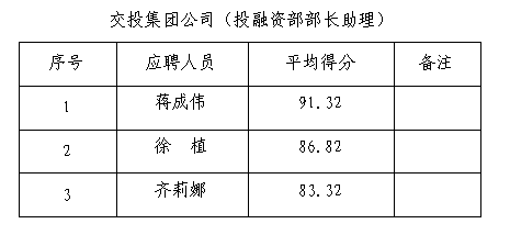 根據(jù)《銅陵市綜合交通投資集團有限公司公開招聘人員公告》,我公司已于2022年3月9日開展銅陵市綜合交通投資集團有限公司投融資部部長助理面試工作,現(xiàn)將報名參與人員面試成績公示如下: