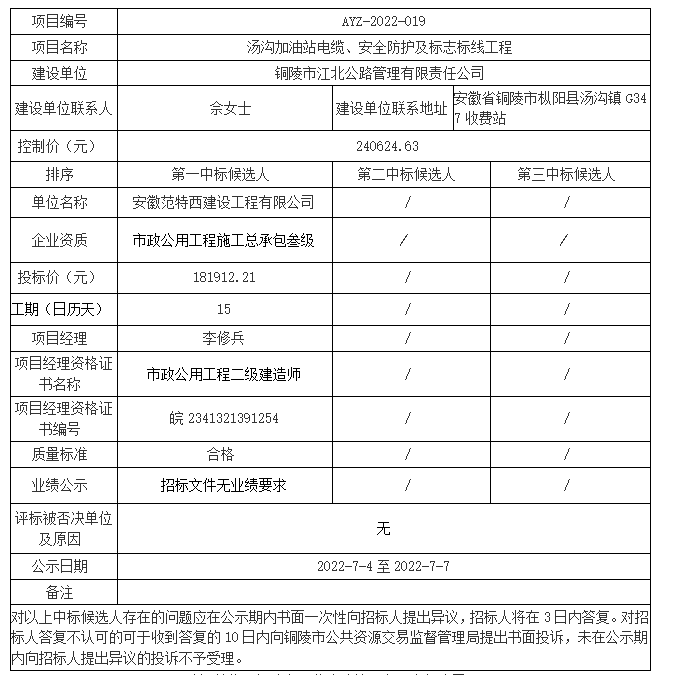 建設單位聯(lián)系地址:安徽省銅陵市樅陽縣湯溝鎮(zhèn)G347收費站