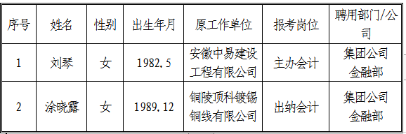 根據《銅陵市交通投資有限責任公司招聘人員公告》,現將出納會計、主辦會計擬聘用人員名單公示如下:
