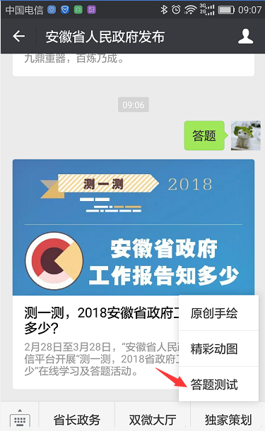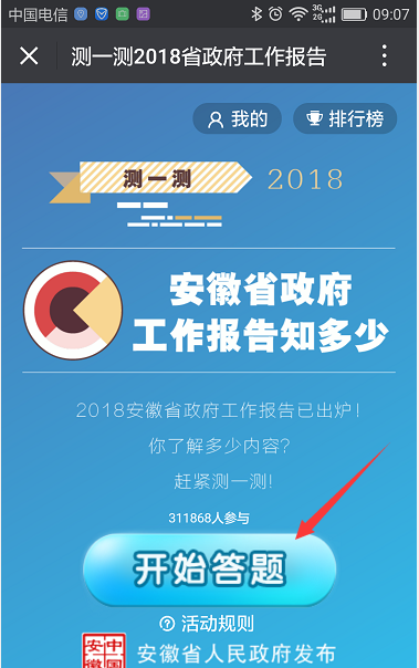 根據市政府辦公室文件通知要求,扎實做好2018省政府工作報告學習貫徹工作,定于2月28日至3月28日,通過“安徽省人民政府發布”微信平臺開展“測一測,2018省政府工作報告知多少”在線學習及答題活動。