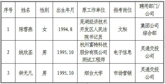 根據(jù)《銅陵市交通投資有限責(zé)任公司招聘人員公告》,現(xiàn)將文秘、電子信息、市場(chǎng)營(yíng)銷(xiāo)擬聘用人員名單公示如下: