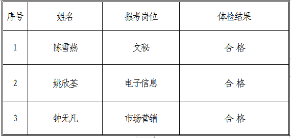 根據《銅陵市交通投資有限責任公司招聘人員公告》,集團公司綜合部于2018年12月12日組織報考文秘、電子信息、市場營銷職位的考生參加體檢,現將相關體檢結果向社會進行公示: