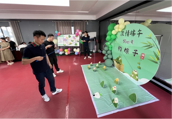 在游戲活動(dòng)現(xiàn)場(chǎng),充滿節(jié)日氣氛的裝飾映入眼簾,彩色的氣球、精美的展板,還有各式花樣的粽子、釣竿等道具,職工們紛紛揮動(dòng)釣竿,試圖將掛有粽子的釣線準(zhǔn)確地投入預(yù)設(shè)的“粽子池”中。一時(shí)間,現(xiàn)場(chǎng)歡聲笑語、熱鬧非凡。