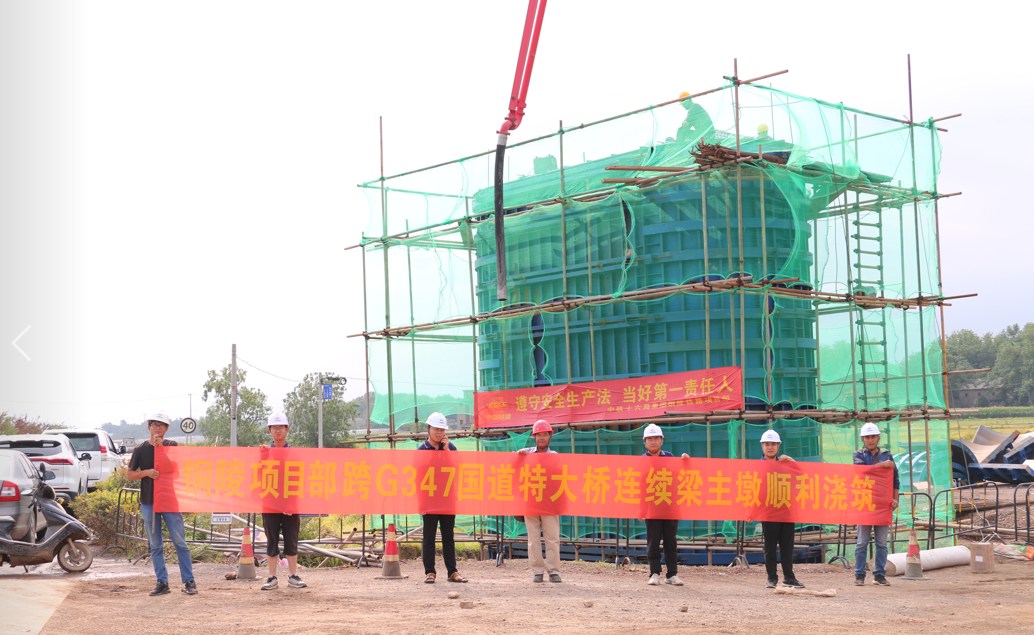 日前,歷經6小時連續施工,銅陵港江北港區鐵路專用線跨國道G347特大橋連續梁首個主墩順利澆筑完成。