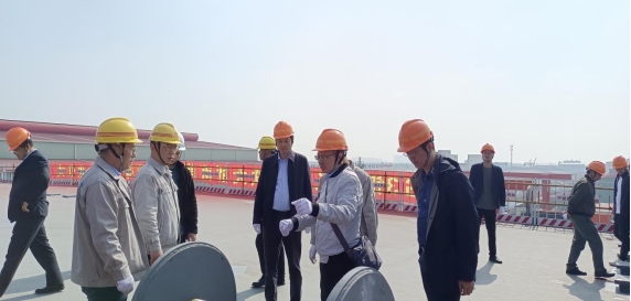 湯世才一行首先前往驗收現(xiàn)場,詳細了解了鋼梁節(jié)段整體制造首節(jié)段總拼過程、結(jié)構(gòu)特點及重難點分析等內(nèi)容,并對質(zhì)量、安全、進度提出了要求及建議。