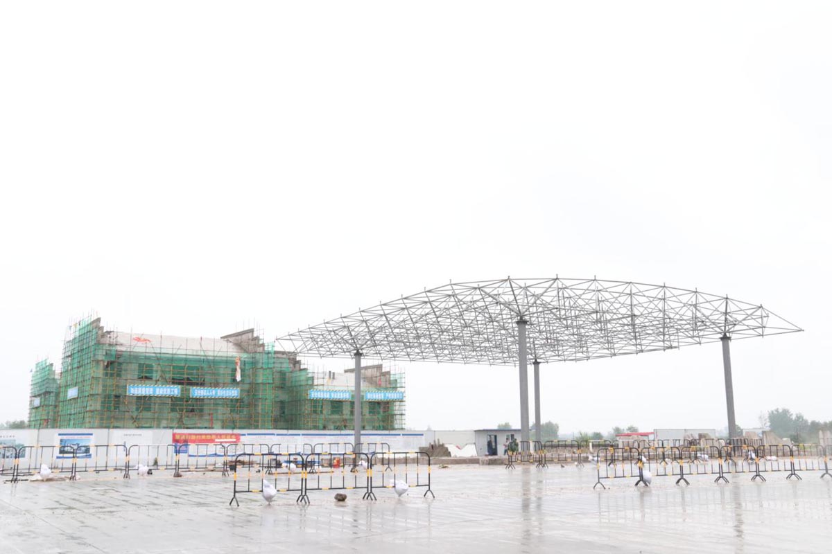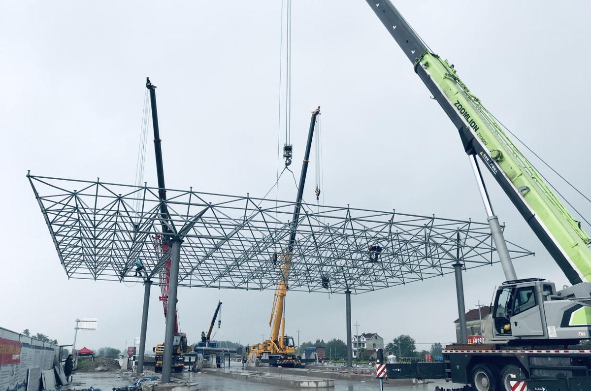 7月12日,G347湯溝收費區(qū)完成收費大棚半幅網(wǎng)架吊裝,預計7月底完成全部收費大棚網(wǎng)架吊裝。